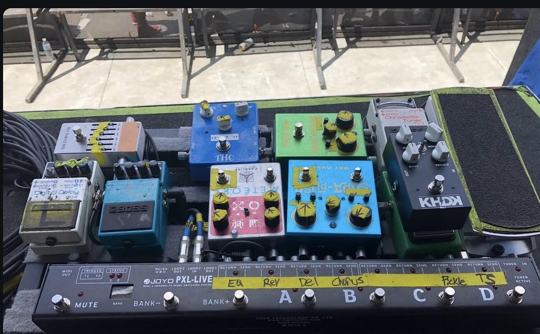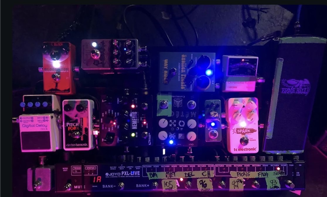This is my current board. Excuse the pic I’m on tour and it’s on stage. I use a temple audio board with some mods on the side for a simple patch bay. I run vocal effects for our singer via my board so there’s an XLR in and a wet/dry out. I use the Seymour Duncan power stage 200 for my power amp into a mesa standard cab. There’s a signature pedal of mine on there by Oneder effects called the HW-2 which is awesome and I use it every night. Next to that is the boss DD-6 which i use for the home effect, you’ll notice that’s been on every board over the years. I use it to make noise.