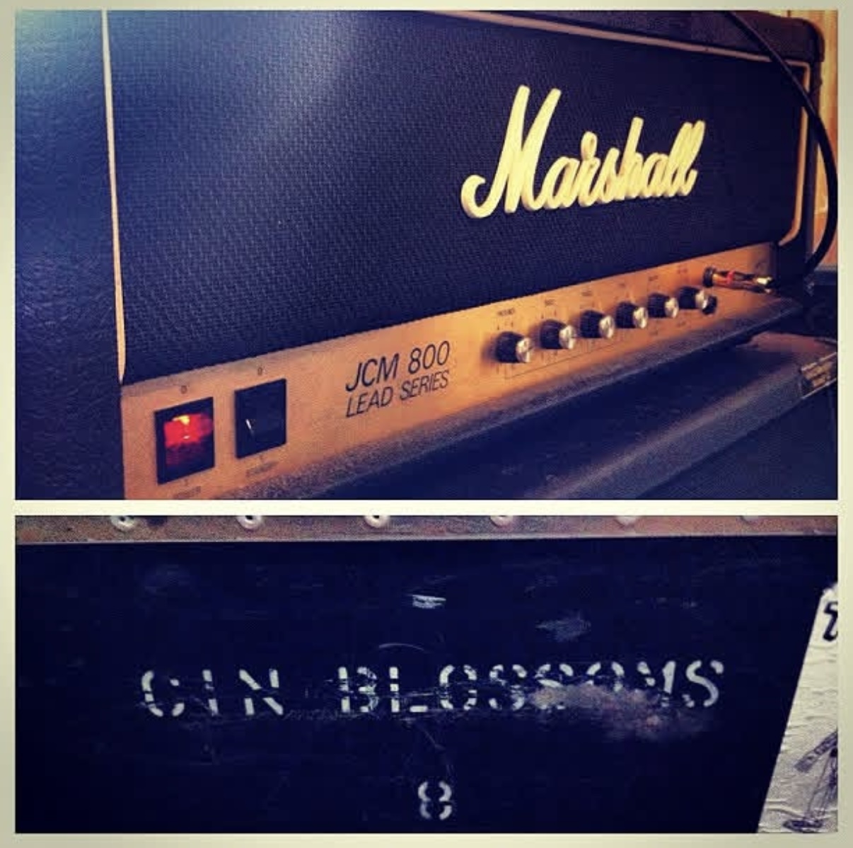 For blinded things changed a little. Our van was stolen from Chicago which had my trusty 5150 II in it, a shitty Marshall cab with white Rolex as well as a black LTD EC-1000 that I got to replace the previous orange one I mentioned earlier because it broke at the headstock. For the record I used a newly acquired JCM-800 2203 that was supposedly owned by the Gin Blossoms prior, a stencil on the head case indeed says “GIN BLOSSOMS” and there’s a sticker on the head from a music shop in AZ. I tried reaching out to them to confirm but never heard back. We did that, with a MIJ HM-2 and this new EC-1000 for one side. Jay played on this record and he had a pretty sick Soldano SLO 100 that sounded awesome for the other side and then I think.