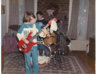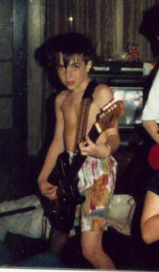 I first started really playing around age eight or nine. I have these pictures of me playing two guitars that I don’t ever remember acquiring—I think I may have “borrowed” them from a friend’s house. My first real guitar that I went and picked out from a store was a red Fender Squier Strat. I’m pretty sure I had a small Peavey amp to go with it, because everybody had a Peavey in the late 1980s.